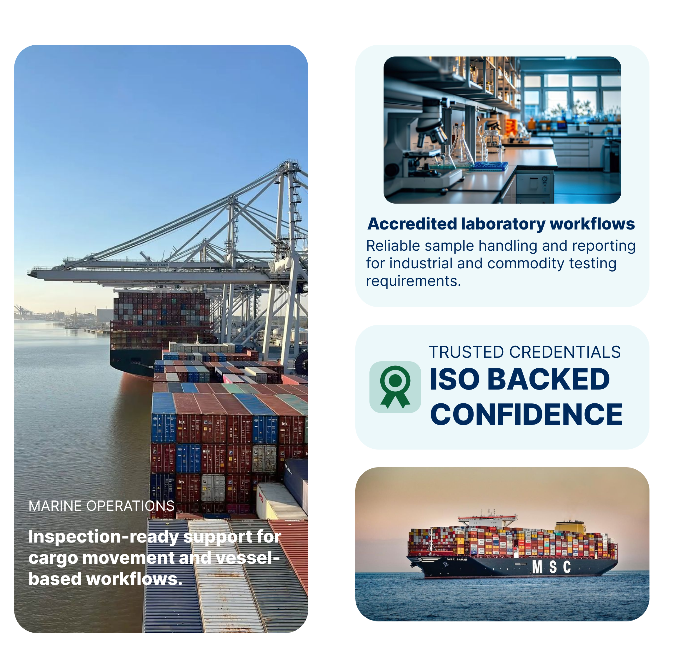 End-to-End Survey & Testing Solutions Under One Roof ISO/IEC 17025:2017 Accredited Laboratory | Marine, Cargo & Inspection Experts built for industrial clients, exporters, importers, and logistics companies across India.